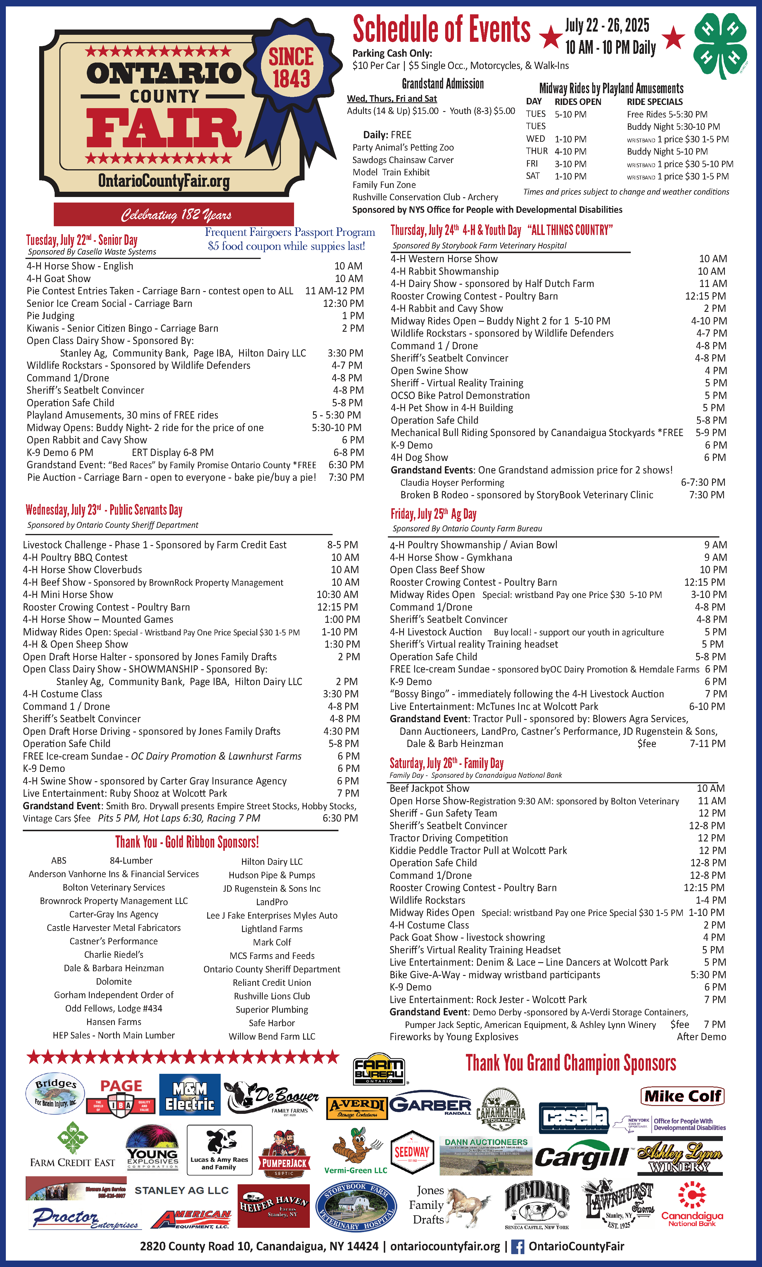 The Ontario County Fair Board is proud to celebrate our 183rd County Fair. We are committed to providing a venue where people can exhibit agricultural products of all types and to educate the public and foster the development of our youth. After all, our motto is ‘Cultivating the Next Generation’. Featured events such as 4-H youth activities and events, youth livestock and animal shows, vendors and Exhibitors Hall, live music and food vendors and Midway rides by Playland Amusements will also occur daily. Other free featured attractions include Party Animals Petting Zoo, model train displays, and Ontario County sheriff demonstrations. Fairgoers can learn about Ontario County agriculture by visiting the animal exhibits, rooster crowing contests, dairy shows and livestock challenges.